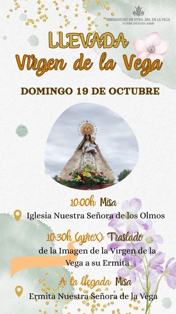 El próximo domingo 19 de octubre de 2025, la localidad de Torre de Juan Abad celebrará uno de los actos más solemnes y emotivos de su calendario religioso: la Llevada de la Virgen de la Vega. Esta celebración, que entrelaza tradición, espiritualidad y unión comunitaria, simboliza el vínculo eterno entre la patrona y su pueblo.