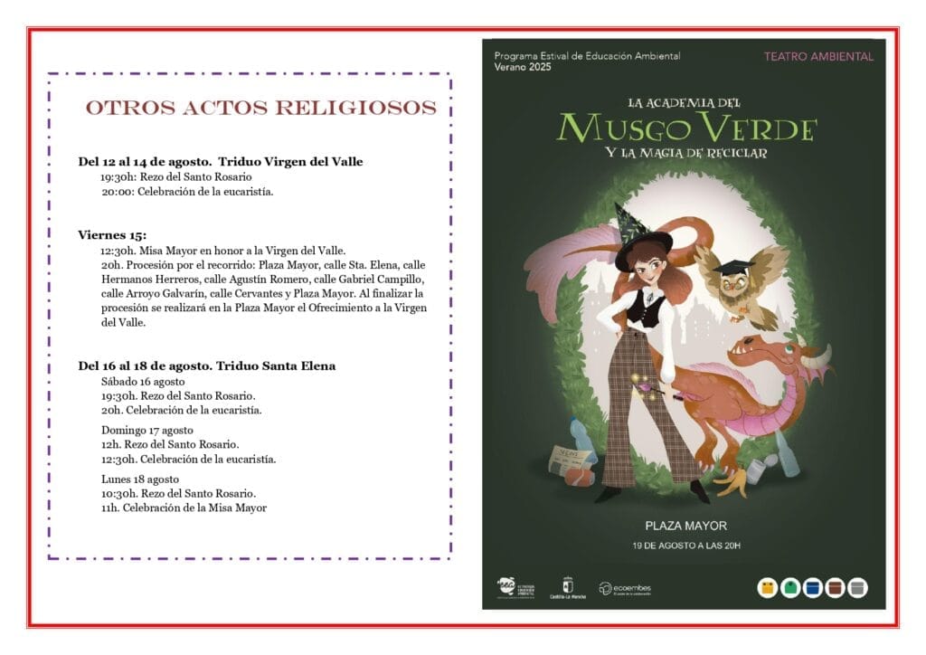- Martes 19 de agosto, 20.00 h. Teatro ambiental en la Plaza Mayor: La Academia del Musgo Verde y la Magia de Reciclar.