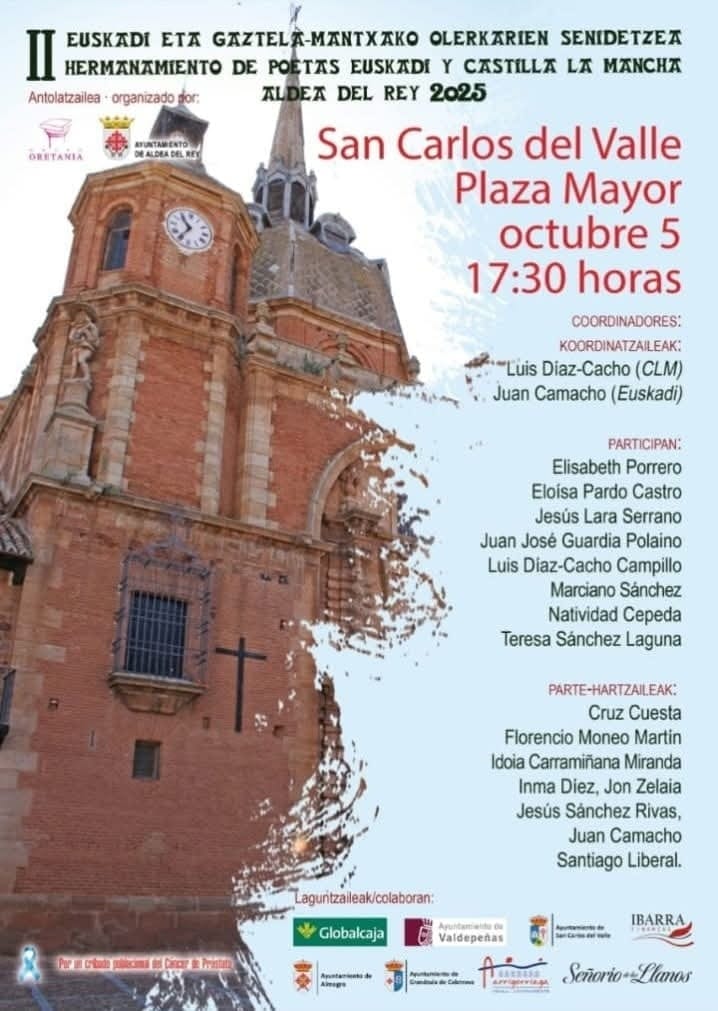 La actividad central será un recital poético libre que se celebrará en la Plaza Mayor de San Carlos del Valle a las 17:30 horas. Coordinado por Luis Díaz-Cacho (CLM) y Juan Camacho (Euskadi), contará con la participación de un destacado elenco de poetas: