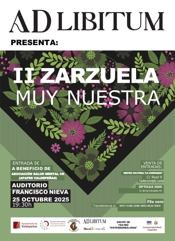 El próximo sábado 25 de octubre de 2025, el Auditorio Municipal Francisco Nieva de Valdepeñas se vestirá de gala para acoger la II Zarzuela Muy Nuestra, un evento que une cultura, música y solidaridad. Organizada por el grupo musical Ad Libitum, esta cita promete llenar de emoción, arte y sentimiento el corazón de la Ciudad del Vino con una cuidada selección de las obras más representativas del género lírico español.