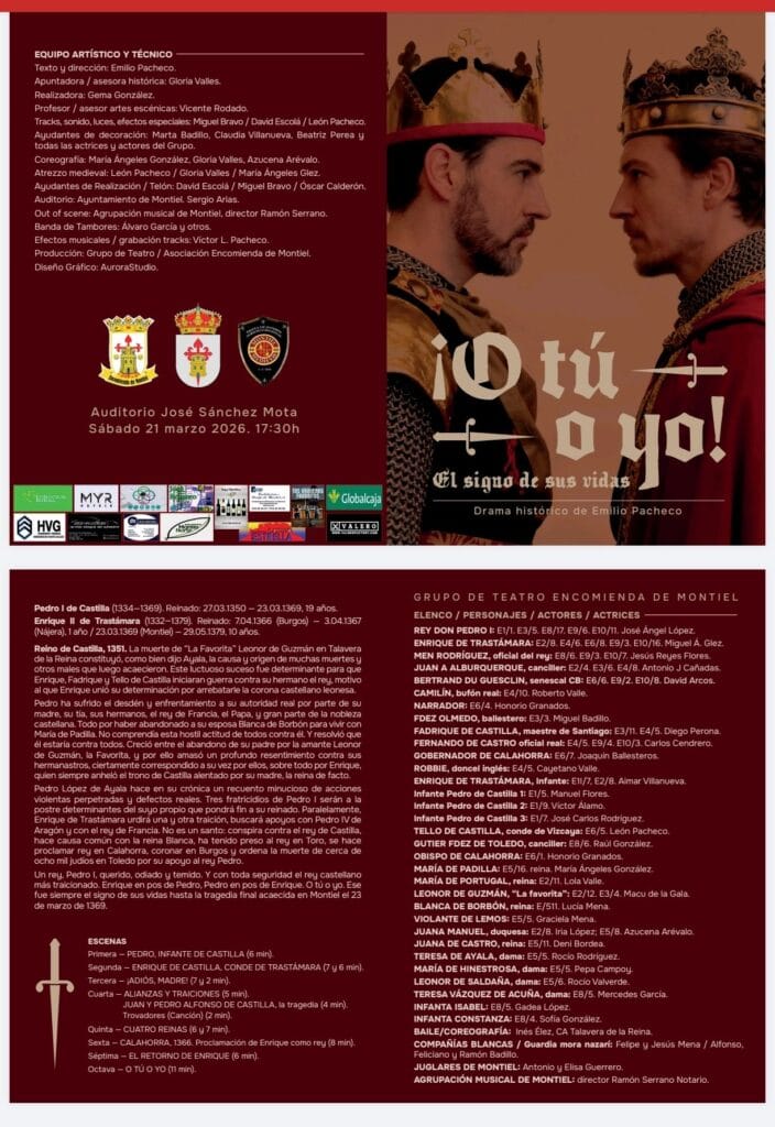 Dentro de la programación cultural de la Montiel Medieval XX edición 2026, uno de los actos destacados será la representación teatral “¡O tú o yo! El signo de sus vidas”, un drama histórico de Emilio Pacheco.