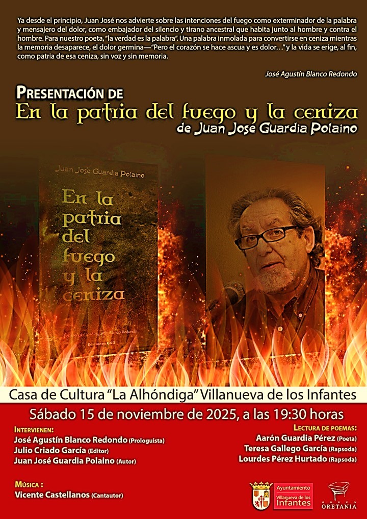 La llama de la literatura volverá a brillar en el Campo de Montiel con una cita cultural imperdible. El próximo sábado 15 de noviembre de 2025, a las 19:30 horas, la Casa de Cultura “La Alhóndiga” de Villanueva de los Infantes acogerá la presentación del libro En la patria del fuego y la ceniza, la más reciente obra del escritor Juan José Guardia Polaino. Un evento que promete ser una velada de palabra, emoción y música en el corazón de la literatura manchega.